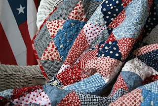 Today, I finally put together 29 (of 30) fat quarters I needed for a quilt pattern I got from http://alittlebitbiased.blogspot.com/. I had many of these in my stash. Some from 10 yrs ago when I first started collecting 30's reproductions, some from my red, white and blue collection, some I had Amber send me that I liked in her quilt and a couple I picked up at my favorite quilt store, Strawberry Patches. I still need one more, but I started cutting them out today. Here are the fabrics.